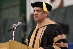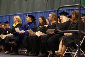 During the School of Business Ceremony, which took place in the Rec Center immediately after the College-wide program, Dean William W. Keep (left) welcomed faculty, graduates and their friends and family.