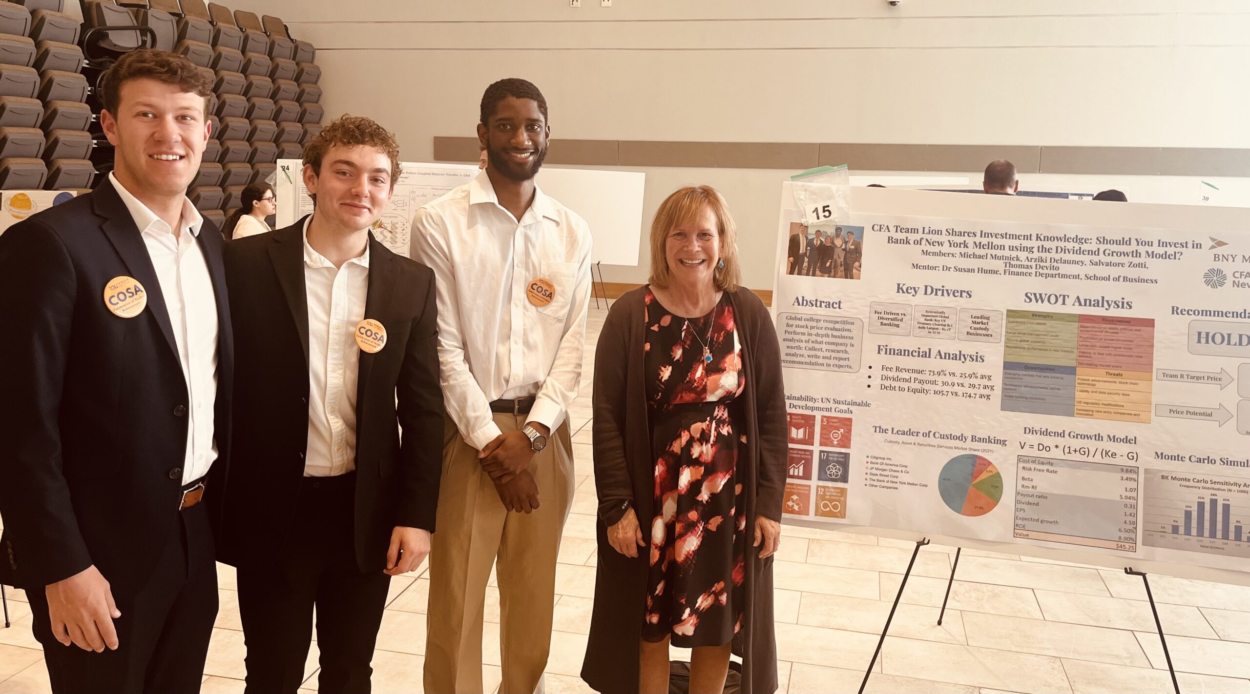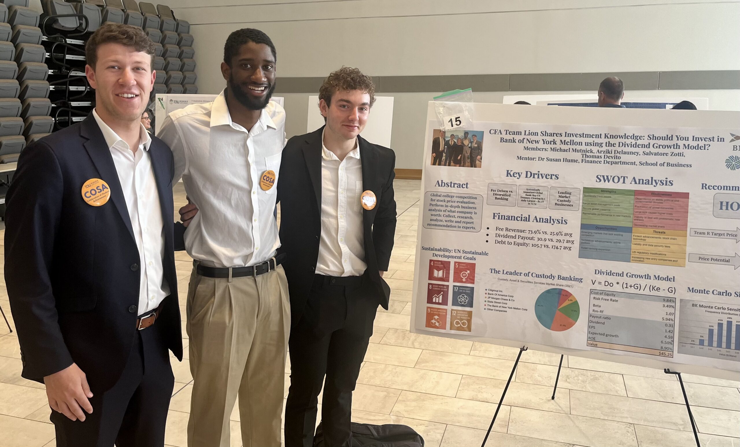- Michael Mutnick, Arziki Delauney, Salvatore Zotti, and Thomas Devito, CFA Team Lion Shares Investment Knowledge: Should You Invest in Bank of New York Mellon using the Dividend Growth Model?, mentored by Susan Hume.