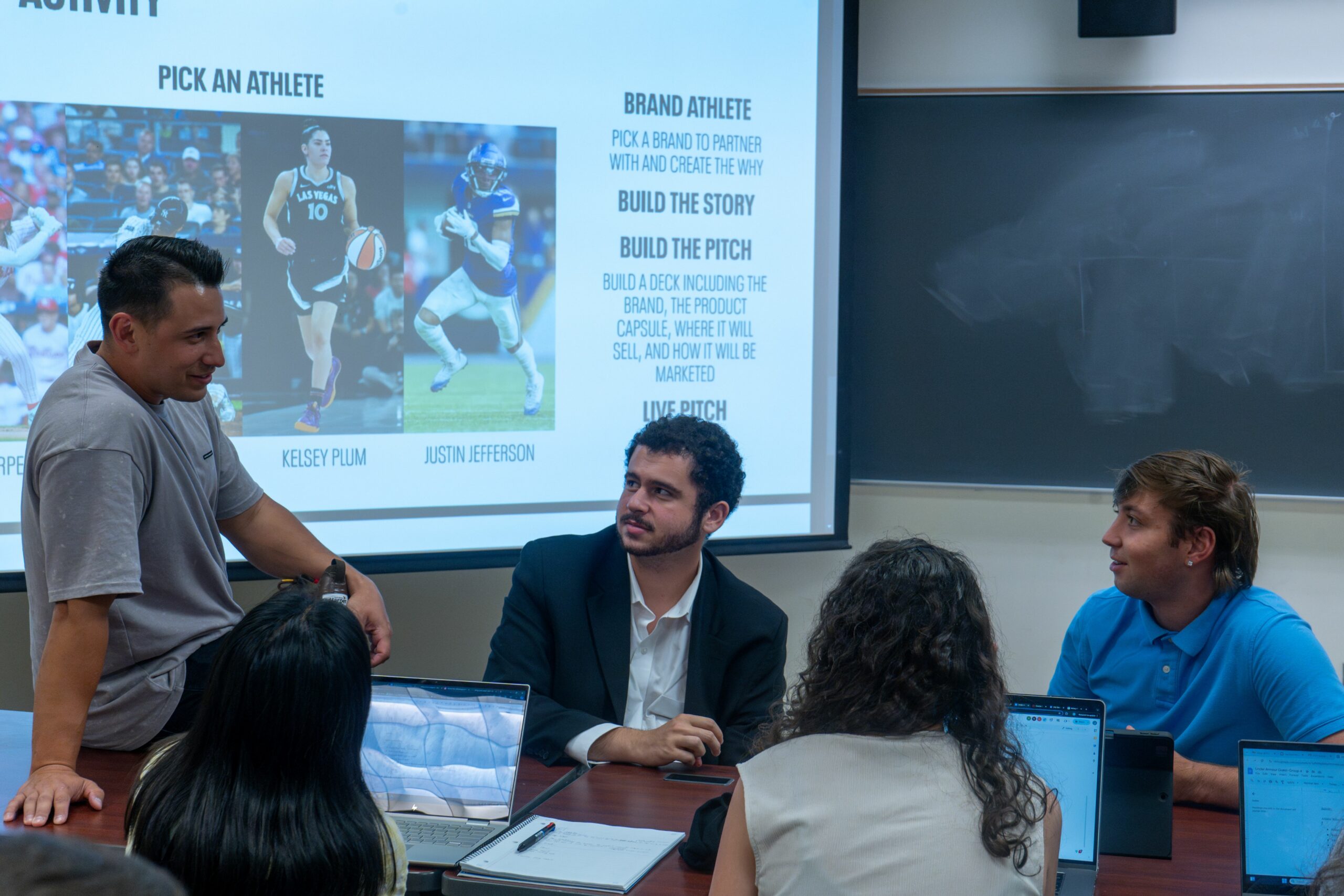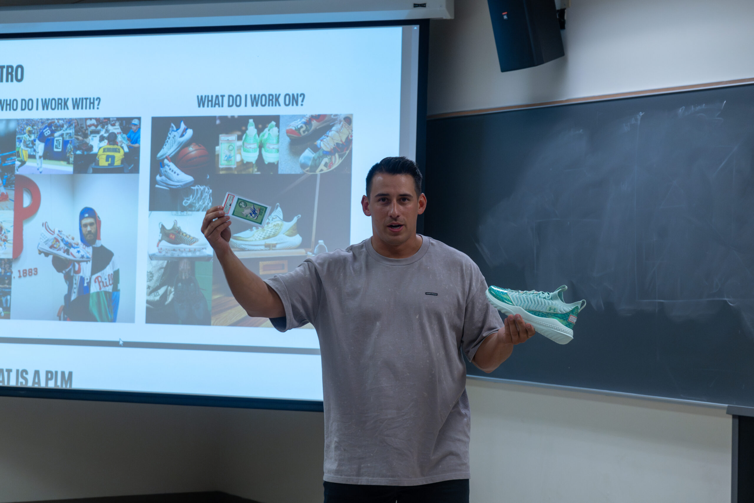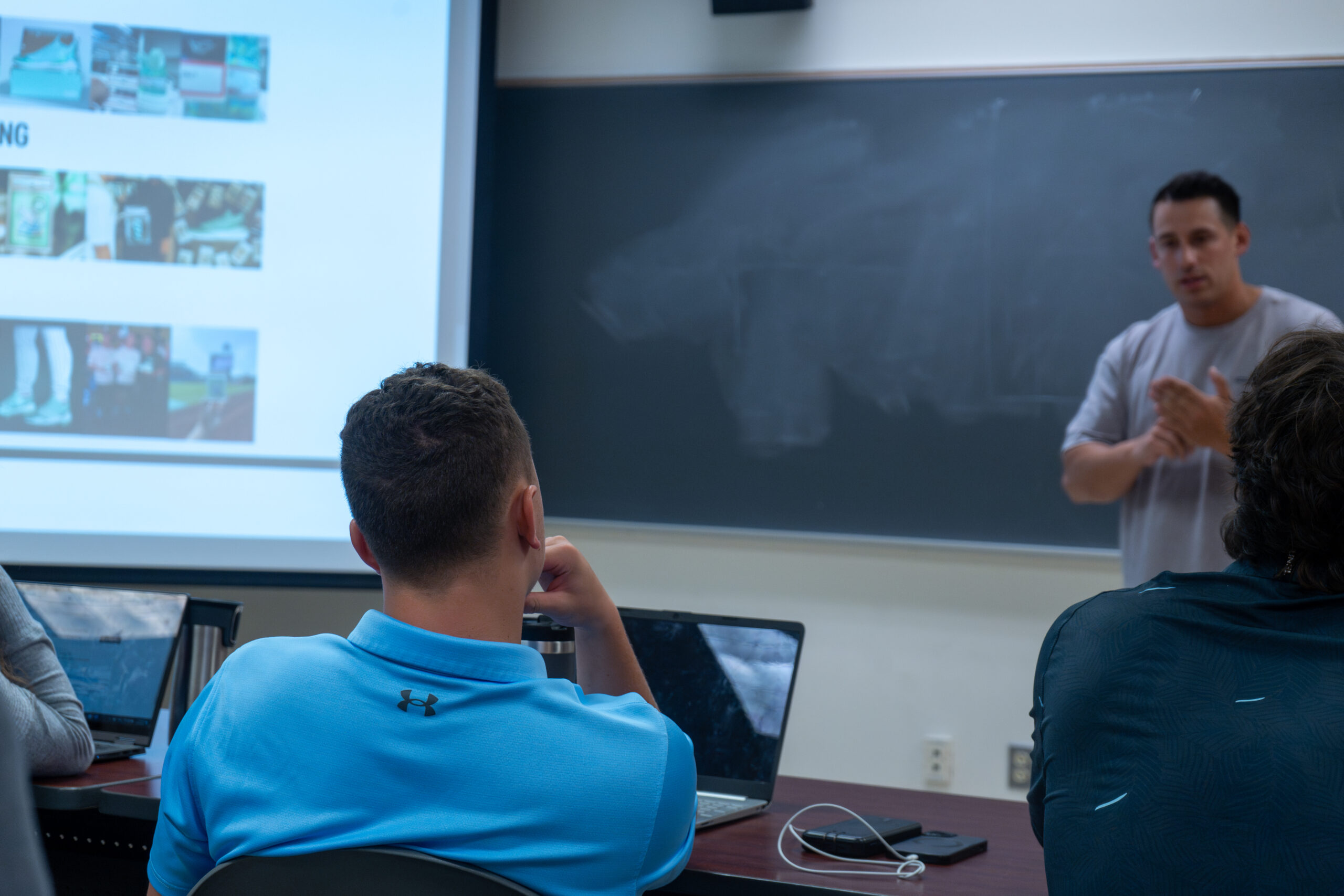 On September 18, 2024, Steven visited Caleb’s MKT370 (Sports Marketing) class. Steven shared his background and experience with the class and talked about the PE footwear at Under Armour. This visit kicked off a semester-long project for the students. The class was divided up into groups, and each group was assigned a professional athlete. The groups will spend the semester working on a sports management plan for PE footwear for their athlete.