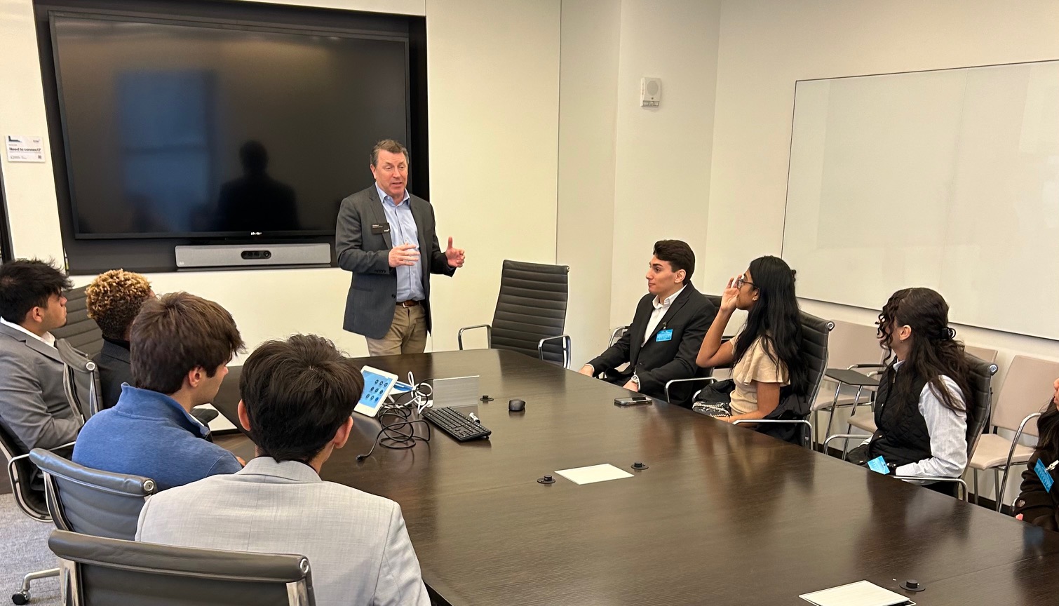 On Wednesday, November 14, 2024, a group of Finance majors joined Jennifer Graf ’96, Peter Simons ’98, and Brandon Klein ’16 at Renaissance Technologies in Manhattan for conversations about their career paths, how TCNJ helped them on their journey, skills most valuable to advancing their careers, the importance of networking, and the most challenging and rewarding aspects of their careers.