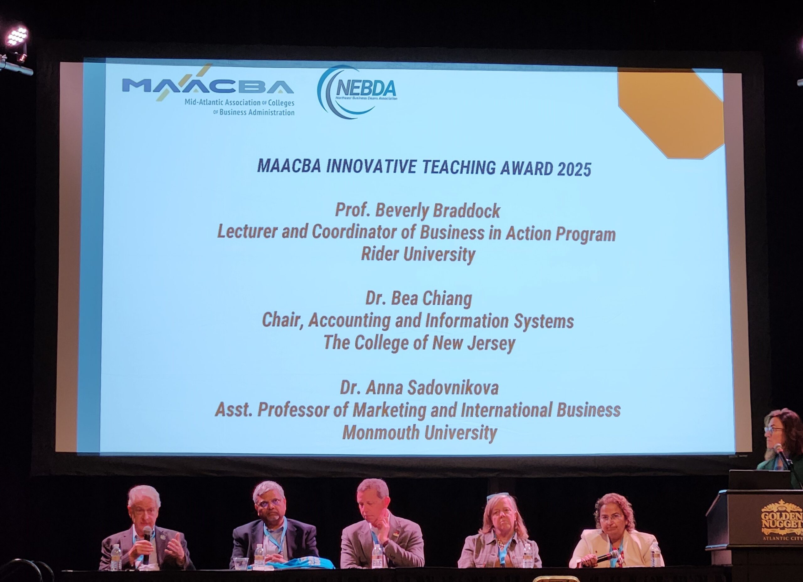 On October 7, 2025, Professor Bea Chiang, Chair of Accounting at TCNJ, was honored with the Innovation in Teaching Award at the Mid-Atlantic Association of Colleges of Business Administration (MAACBA) Annual Conference hosted by Stockton University.